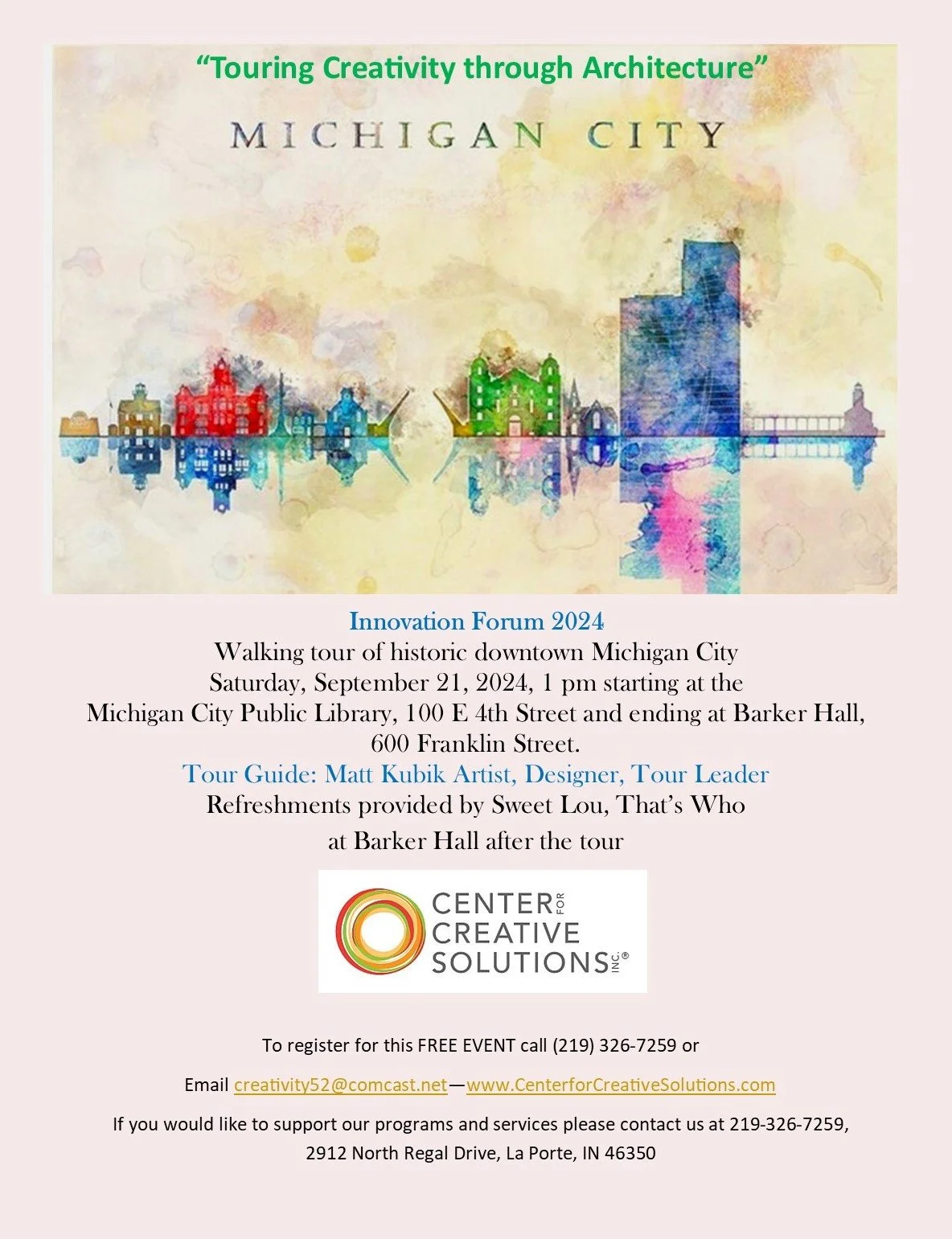 This year’s annual Innovation Forum is made possible thanks in part to the support of the B. R. Foundation, Dr. and Bina Gupta of Michigan City, the Emerson House, and the Center for Creative Solutions. To register, please call 219-326-7259, or send an email to creativity52@comcast.net, or go to CenterforCreativeSolutions.com.